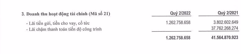 Tuy nhiên, quý 2/2022 doanh thu hoạt động tài chính thất thu khi chỉ mang về hơn 1,2 tỷ đồng trong khi cùng kỳ 2021 mang về hơn 41,5 tỷ đồng. Nguyên nhân do kỳ này chỉ ghi nhận doanh thu lãi tiền gửi, tiền cho vay, cổ tức hơn 1,2 tỷ đồng trong khi cùng kỳ đạt gần 4 tỷ; phần lãi chậm thanh toán tiến độ công trình kỳ này không ghi nhận doanh thu, trong khi cùng kỳ 2021 đạt gần 38 tỷ đồng.