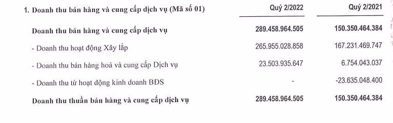 Cụ thể, theo báo cáo tài chính hợp nhất quý 2/2022, doanh thu thuần đạt hơn 289 tỷ đồng, tăng đến 93% so với cùng kỳ. Doanh thu này chủ yếu đến từ chủ yếu đến từ hoạt động xây lắp gần 266 tỷ đồng, tăng 59%; bán hàng hóa và cung cấp dịch vụ cao gấp 3,4 lần cùng kỳ, lên hơn 23 tỷ đồng; kỳ này không có doanh thu từ hoạt động kinh doanh bất động sản.
