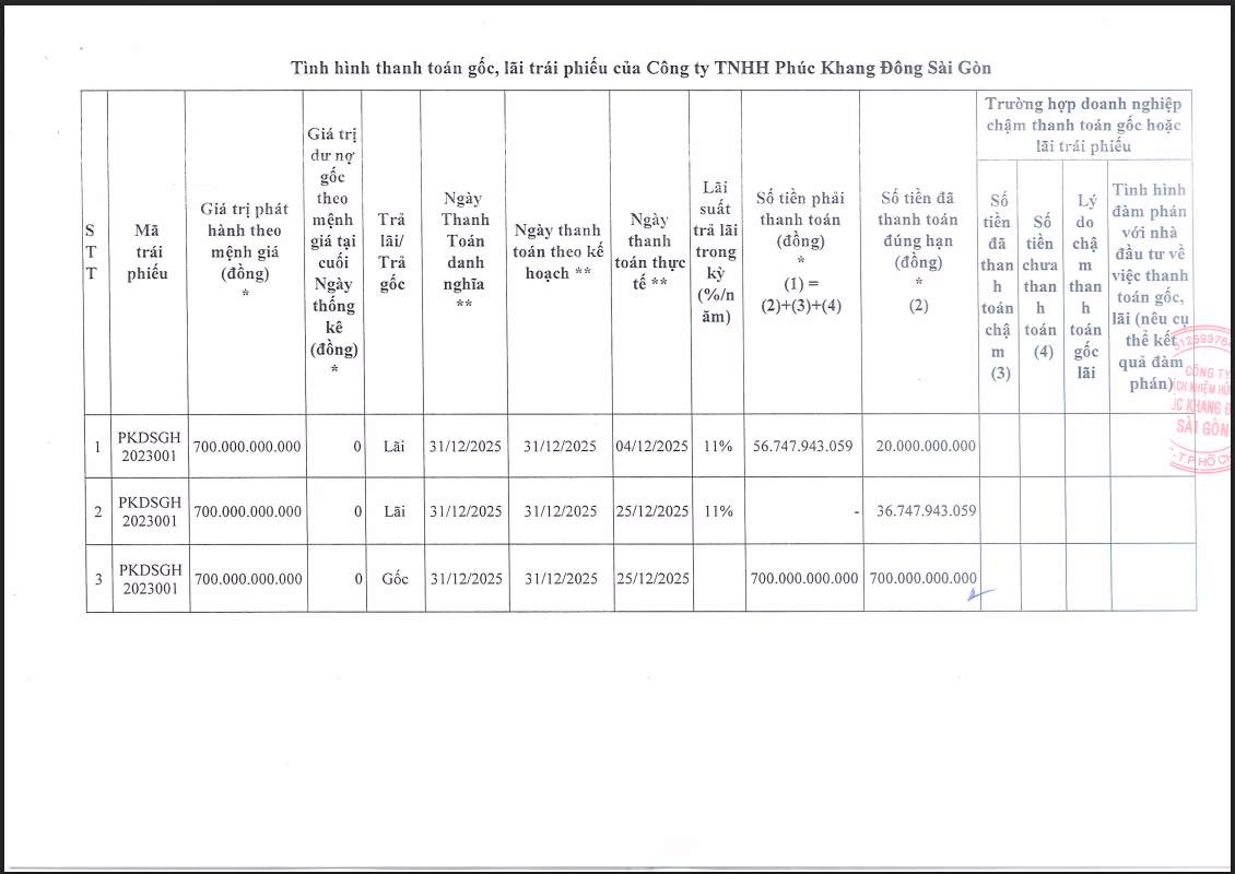 Theo thông tin từ Sở Giao dịch Chứng khoán Hà Nội (HNX), ngày 25/12/2025, Phúc Khang Đông Sài Gòn đã thực hiện thanh toán 700 tỷ đồng tiền gốc và hơn 36,7 tỷ đồng tiền lãi cho lô trái phiếu mã PKDSGH2023001, qua đó tất toán lô trái phiếu này đúng hạn.