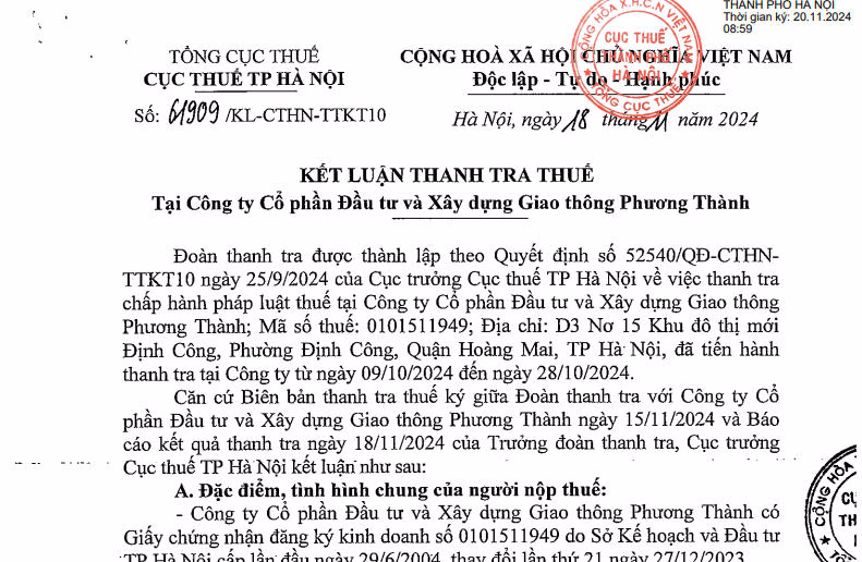 Cục Thuế TP. Hà Nội vừa ban hành kết luận thanh tra thuế tại Công ty cổ phần Đầu tư và xây dựng giao thông Phương Thành (Phương Thành Tranconsin), trong đó chỉ ra nhiều vi phạm của doanh nghiệp này.