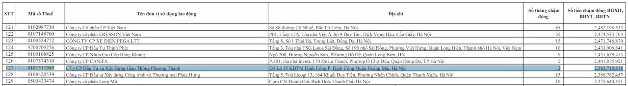 Đáng chú ý, trong danh sách này có sự xuất hiện của Công ty cổ phần Đầu tư và Xây dựng Giao thông Phương Thành (Phương Thành Tranconsin), với 2 tháng chậm đóng số tiền 2,38 tỷ đồng.