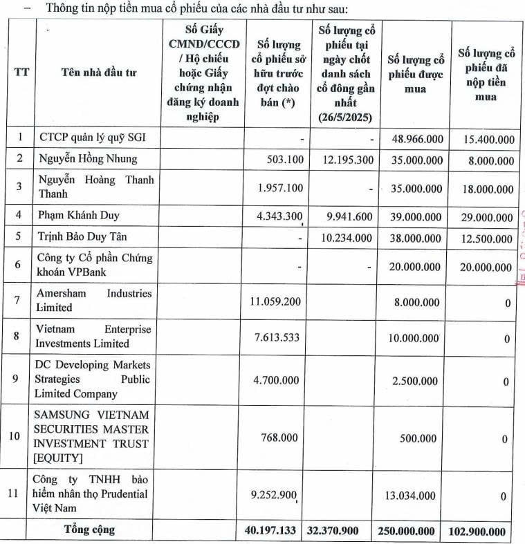 Trong khi đó, SGI Capital chỉ mua 15,4 triệu cổ phiếu trong tổng số gần 49 triệu đơn vị đăng ký. Về phía nhà đầu tư cá nhân, ông Phạm Khánh Duy – người "mạnh tay" nhất – cũng chỉ mua 29 triệu cổ phiếu, thấp hơn 10 triệu đơn vị so với đăng ký.