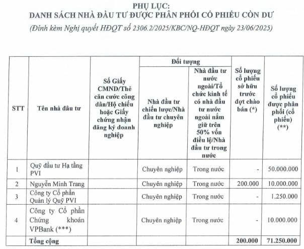Danh sách nhà đầu tư mua cổ phiếu còn dư cũng đã được hé lộ. Cụ thể, Quỹ đầu tư Hạ tầng PVI (PIF) mua vào 50 triệu cổ phiếu, trong khi Công ty CP Quản lý Quỹ PVI (PVI Asset Management) nhận 1,25 triệu cổ phiếu.