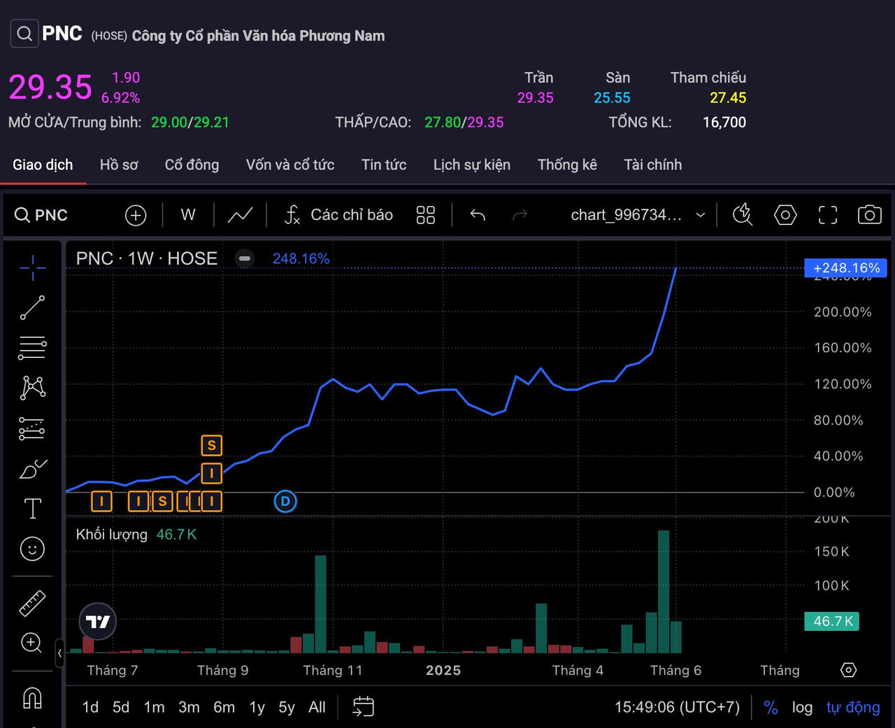 Kể từ khi thương vụ M&A được công bố vào ngày 19/5, cổ phiếu PNC đã có 5 phiên tăng gần như kịch biên độ. Dù có xen kẽ một vài phiên điều chỉnh nhẹ, nhưng tính đến nay, mã này đã tăng 42% chỉ trong vòng hơn hai tuần. Đà tăng mạnh phản ánh sự quan tâm lớn của giới đầu tư đối với thương vụ sáp nhập giữa “vua bút bi" Thiên Long và chuỗi nhà sách lâu đời Phương Nam.