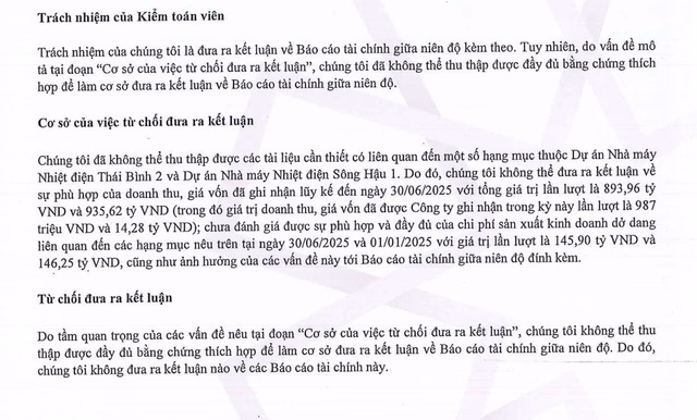 Đáng chú ý, báo cáo tài chính giữa niên độ nằm 2025 của PVC- MS bị kiểm toán từ chối đưa ra ý kiến. Cụ thể, kiểm toán cho biết đã không thểthu thập được các tài liệu cần thiết có liên quan đến một số hạng mục thuộc Dựán Nhà máy Nhiệt điện Thái Bình 2 và Dự án Nhà máy Nhiệt điện Sông Hậu 1.