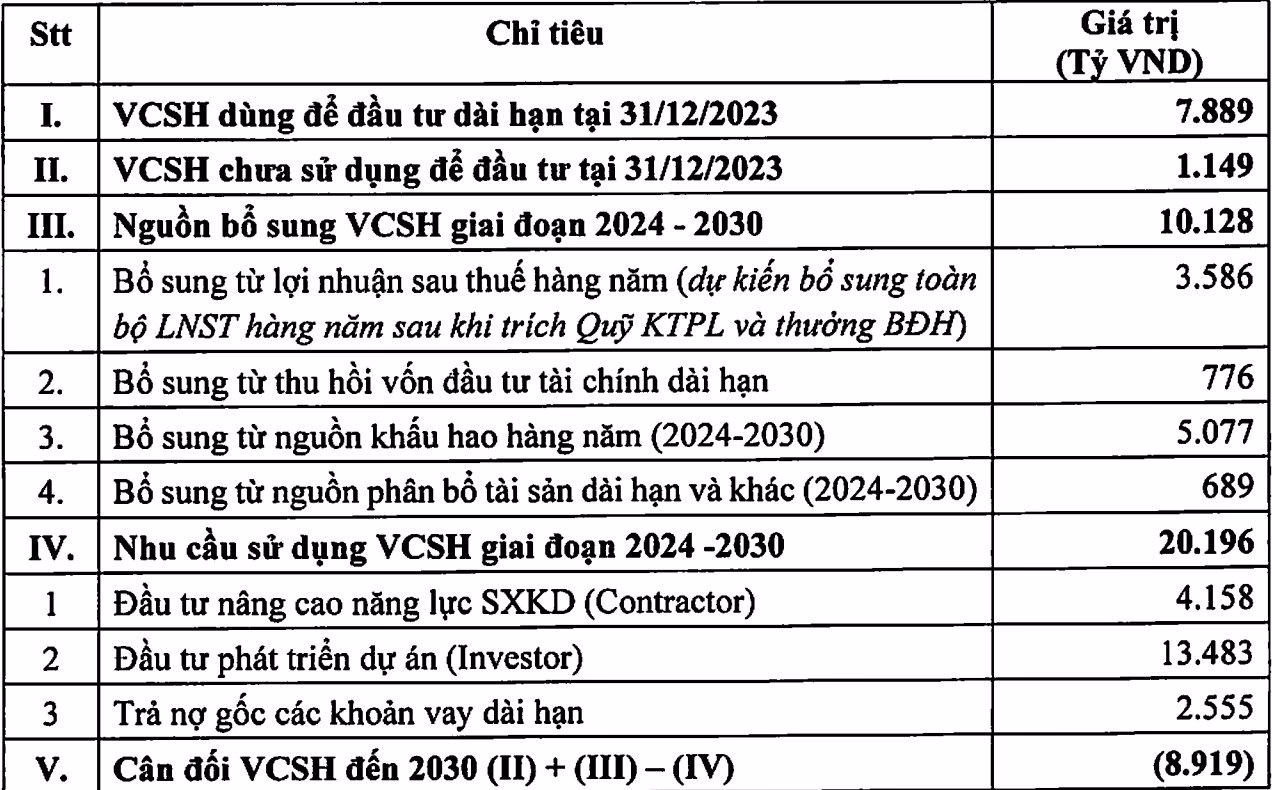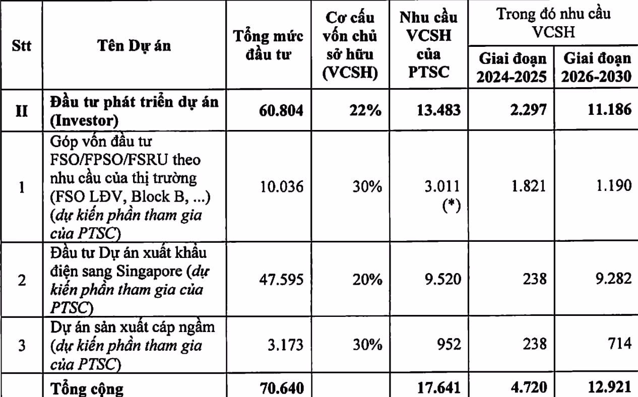 Với các gói thầu và dự án nêu trên, PVS cần nhu cầu vốn lớn cho giai đoạn 2024-2030. Theo phương án mà doanh nghiệp này đưa ra, để đầu tư nâng cao năng lực sản xuất kinh doanh và đầu tư phát triển dự án, tổng mức đầu tư lên tới 70.640 tỷ đồng. Trong đó, nhu cầu về vốn chủ sở hữu của PVS là 17.641 tỷ đồng (bao gồm 4.720 tỷ đồng giai đoạn 2024-2025 và 12.921 tỷ đồng giai đoạn 2026-2030).