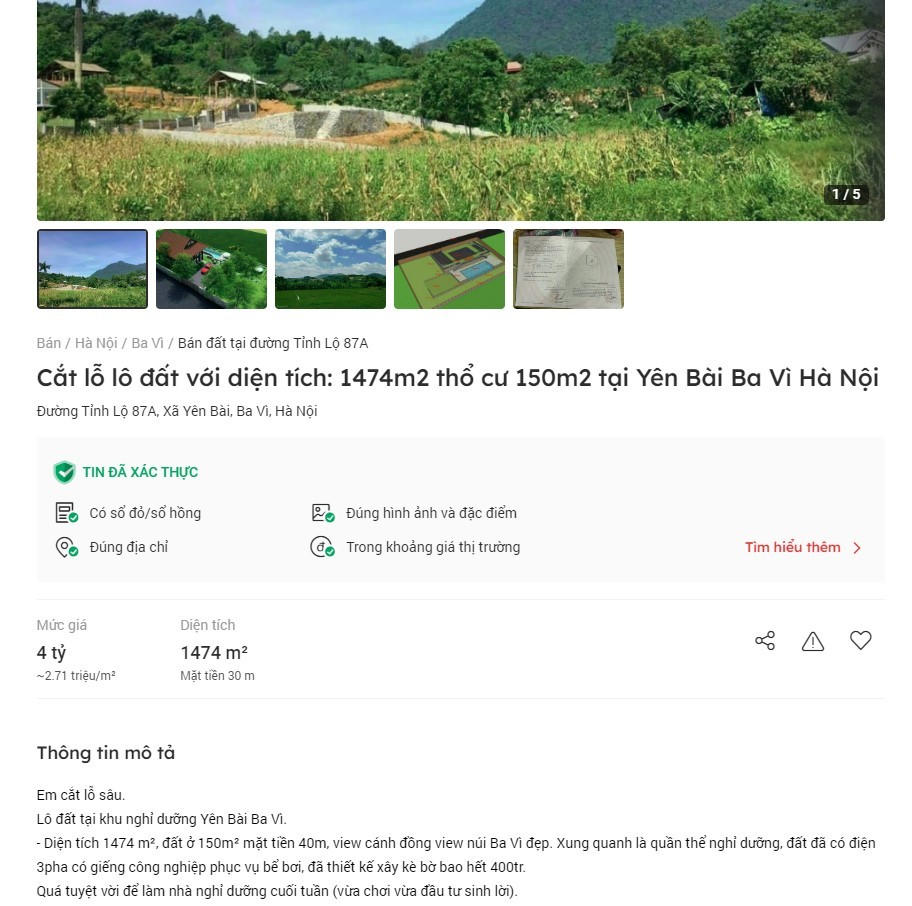 Lấy đơn cử như 1 lô đất tại khu nghỉ dưỡng Yên Bài Ba Vì với diện tích 1474 m2, đất ở 150m2 mặt tiền 40m được rao bán với giá 4 tỷ.