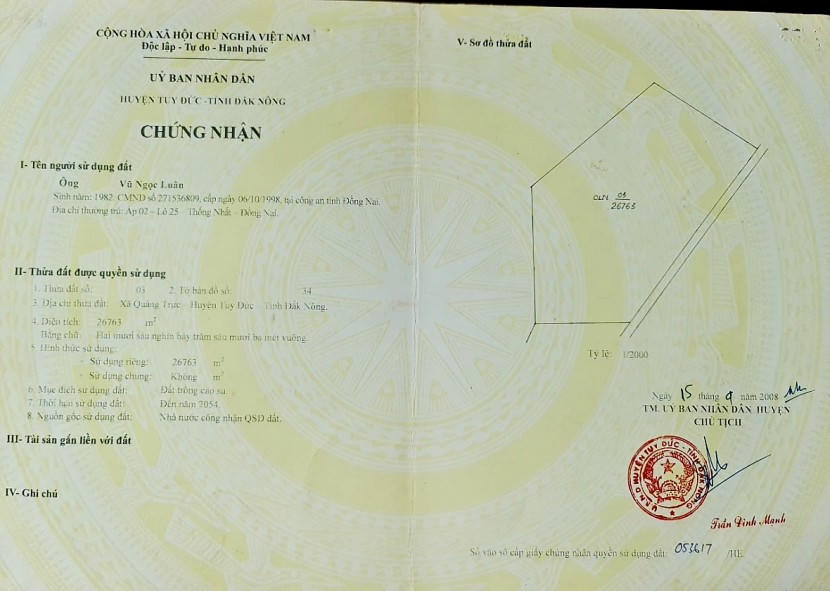 Điển hình là diện tích đất hơn 21,3ha thuộc 8 thửa đất số 01, 02, 03, 04, 05, 07, 08 và 09, tờ bản đồ số 34, nằm trên địa bàn xã Quảng Trực, huyện Tuy Đức. Theo tìm hiểu của phóng viên Tạp chí điện tử Kinh doanh và Phát triển, 8 thửa đất này đã được UBND huyện Tuy Đức cấp Giấy chứng nhận quyền sử dụng đất (sổ đỏ) cho các cá nhân, gồm: ông Vũ Ngọc Luân, sinh năm 1982 (thường trú tại ấp 02, lô 25, Thống Nhất, tỉnh Đồng Nai) được cấp sổ đỏ đối với các thửa số 01, 02. 03, 05, 07, 08 và 09; ông Phạm Ngọc Biết (thường trú tại xã Lạc Lâm, huyện Đơn Dương, tỉnh Lâm Đồng) được cấp sổ đỏ cho thửa đất số 04.