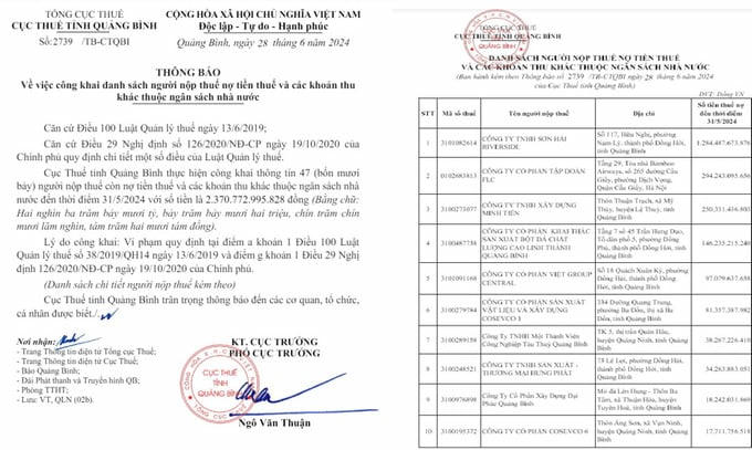 Quảng Bình công khai nhiều doanh nghiệp nợ thuế gần 2.400 tỷ đồng