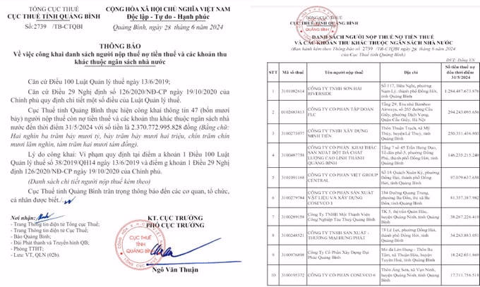 Cục Thuế Quảng Bình vừa công khai 47 doanh nghiệp nợ tiền thuế và các khoản thu khác thuộc ngân sách nhà nước với số tiền là gần 2.400 tỷ đồng.