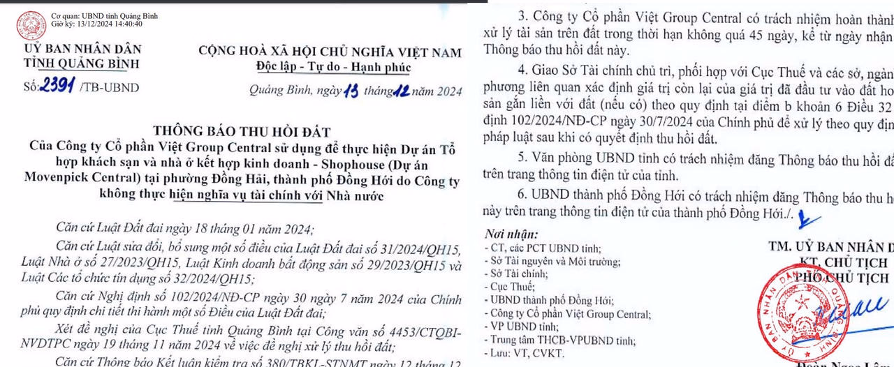 Phó Chủ tịch UBND tỉnh Quảng Bình Đoàn Ngọc Lâm mới đây đã ký ban hành Thông báo thu hồi đất số 2391/TB-UBND đối với Công ty cổ phần Việt Group Central (Việt Group Central) do không thực hiện nghĩa vụ tài chính với Nhà nước.