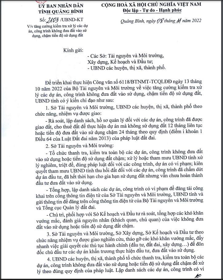 Cụ thể, Phó Chủ tịch UBND tỉnh Quảng Bình yêu cầu Sở Tài nguyên và Môi trường, UBND các huyện, thị xã, thành phố tiến hành rà soát, lập danh sách, hồ sơ quản lý đối với các dự án, công trình đã được giao đất, cho thuê đất để thực hiện dự án mà không sử dụng đất 12 tháng liên tục hoặc tiến độ đưa đất vào sử dụng chậm 24 tháng theo quy định Luật Đất đai năm 2013.