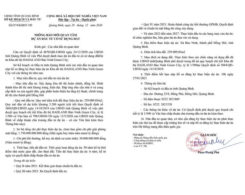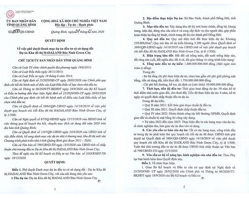Theo đó, dự án Khu đô thị HADALAND Bảo Ninh Green City có tổng mức đầu tư 1.800 tỷ đồng, thực hiện tại xã Bảo Ninh, TP. Đồng Hới, diện tích đất quy hoạch khoảng 259 nghìn m2. Mục tiêu quy hoạch nhằm xây dựng khu đô thị mới với đầy đủ chức năng gồm nhà ở, công trình thương mại, dịch vụ, công trình công cộng, hạ tầng kỹ thuật, hạ tầng xã hội… Thời gian hoạt động dự án là 50 năm kể từ thời điểm nhà nước giao đất, cho thuê đất; tiến độ thực hiện dự án 6 năm, kể từ ngày có quyết định chấp thuận đầu tư dự án.