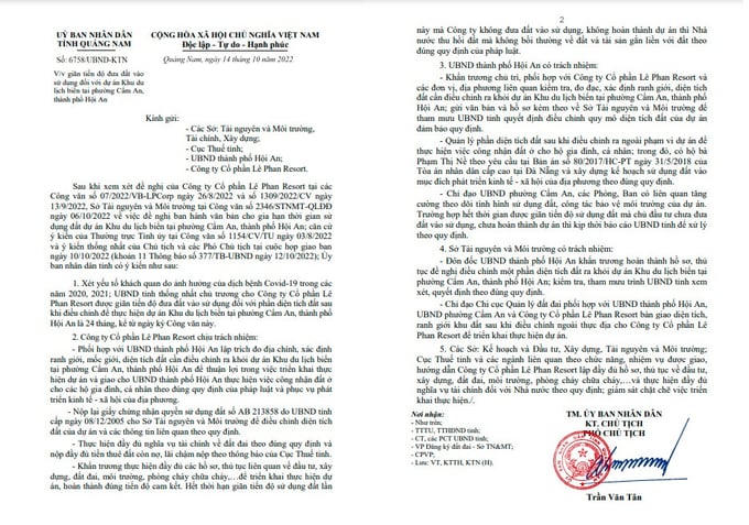 Trong năm 2022, tỉnh Quảng Nam giao Sở Tài nguyên và Môi trường chủ trì, phối hợp với UBND thành phố Hội An và các ngành liên quan rà soát các quy định pháp luật, đánh giá sự phù hợp với quy hoạch, nhu cầu của địa phương và xét đến các văn bản trước đây liên quan đến thu hồi đất, gia hạn tiến độ thực hiện dự án Khu du lịch biển của Công ty cổ phần Lê Phan Resort.