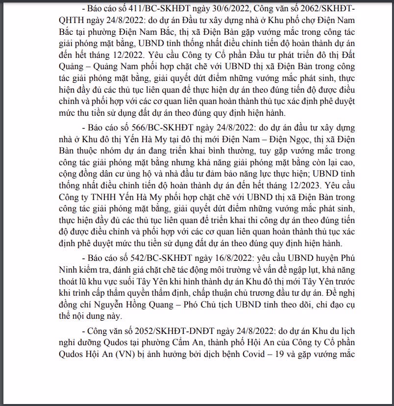 Dự án Khu du lịch nghỉ dưỡng Qudos tại phường Cẩm An, thành phố Hội An của Công ty Cổ phần Qudos Hội An (VN) được UBND tỉnh thống nhất điều chỉnh tiến độ hoàn thành, đưa dự án vào hoạt động đến tháng 6/2024. Công ty Cổ phần Qudos Hội An (VN) lập kế hoạch cụ thể đăng ký với UBND thành phố Hội An, tập trung triển khai thực hiện dự án đối với phần diện tích đã được giải phóng mặt bằng.
