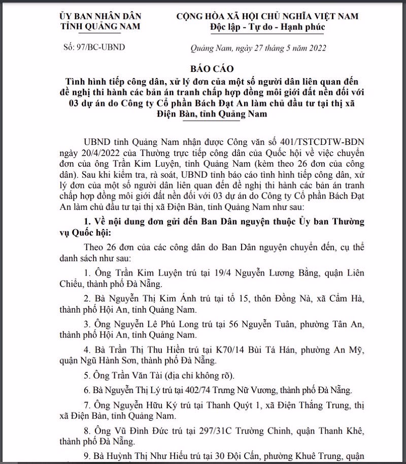 UBND tỉnh Quảng Nam vừa phát đi Báo cáo số 97/BC-UBND về hình tiếp công dân, xử lý đơn của một số người dân liên quan đến đề nghị thi hành các bản án tranh chấp hợp đồng môi giới đất nền đối với 03 dự án do Công ty Cổ phần Bách Đạt An làm chủ đầu tư.