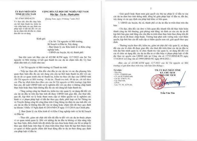 Theo Công văn số 4700/UBND-KTN ngày 19/7 của UBND tỉnh Quảng Nam gửi các Sở, ngành như Sở Tài nguyên và Môi trường; Sở Kế hoạch và Đầu tư; Sở Xây dựng; Ban Quản lý các Khu kinh tế và Khu công nghiệp tỉnh; UBND các huyện, thị xã, thành phố. UBND tỉnh Quảng Nam yêu cầu các đơn vị liên quan, các địa phương theo dõi, đôn đốc thực hiện các kết luận thanh tra, kiểm tra việc chấp hành các quy định của pháp luật về đất đai đối với các dự án chậm tiến độ đầu tư, chậm đưa đất vào sử dụng.
