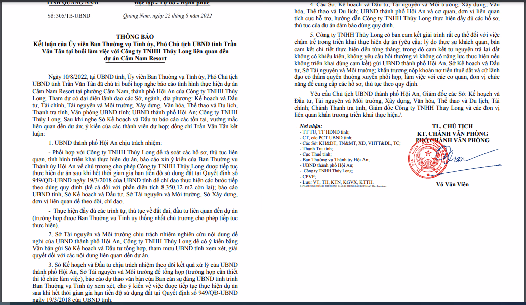 Trong văn bản này, ông Trần Văn Tân yêu cầu UBND thành phố Hội An chịu trách nhiệm phối hợp với Công ty TNHH Thủy Long để rà soát các hồ sơ, thủ tục liên quan, tình hình triển khai thực hiện dự án.