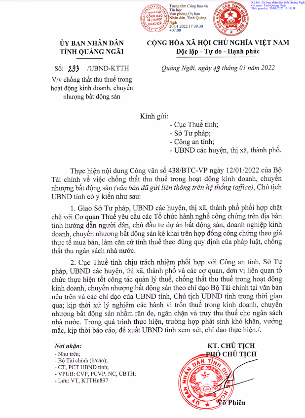 Theo đó, UBND tỉnh Quảng Ngãi yêu cầu thủ trưởng các Sở, ngành và Chủ tịch UBND các huyện, thị xã, thành phố chịu trách nhiệm tổ chức triển khai thực hiện kịp thời các nội dung yêu cầu của Bộ Tài chính và chỉ đạo của UBND tỉnh nhằm tăng cường công tác chống thất thu thuế trong hoạt động kinh doanh, chuyển nhượng bất động sản trên địa bàn.