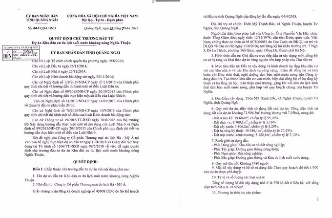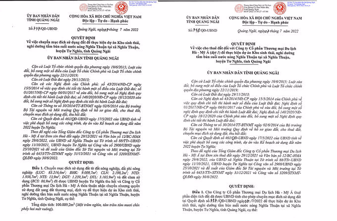 Cụ thể, trong ngày 7/7/2022, UBND tỉnh Quảng Ngãi đã ban hành 2 quyết định lần lượt là: Quyết định 737/QĐ-UBND về việc chuyển mục đích sử dụng đất để thực hiện dự án Khu sinh thái, nghỉ dưỡng tắm bùn suối nước nóng Nghĩa Thuận tại xã Nghĩa Thuận, huyện Tư Nghĩa tỉnh Quảng Ngãi; Quyết định số 738/QĐ-UBND về việc cho thuê đất đối với Công ty Cổ Phần Thương mại Du lịch Hà - Mỹ Á (Công ty Hà - Mỹ Á ) (đợt 1) để thực hiện dự án Khu sinh thái, nghỉ dưỡng tắm bun suối nước nóng Nghĩa Thuận tại xã Nghĩa Thuận, huyện Tư Nghĩa, tỉnh Quảng Ngãi.