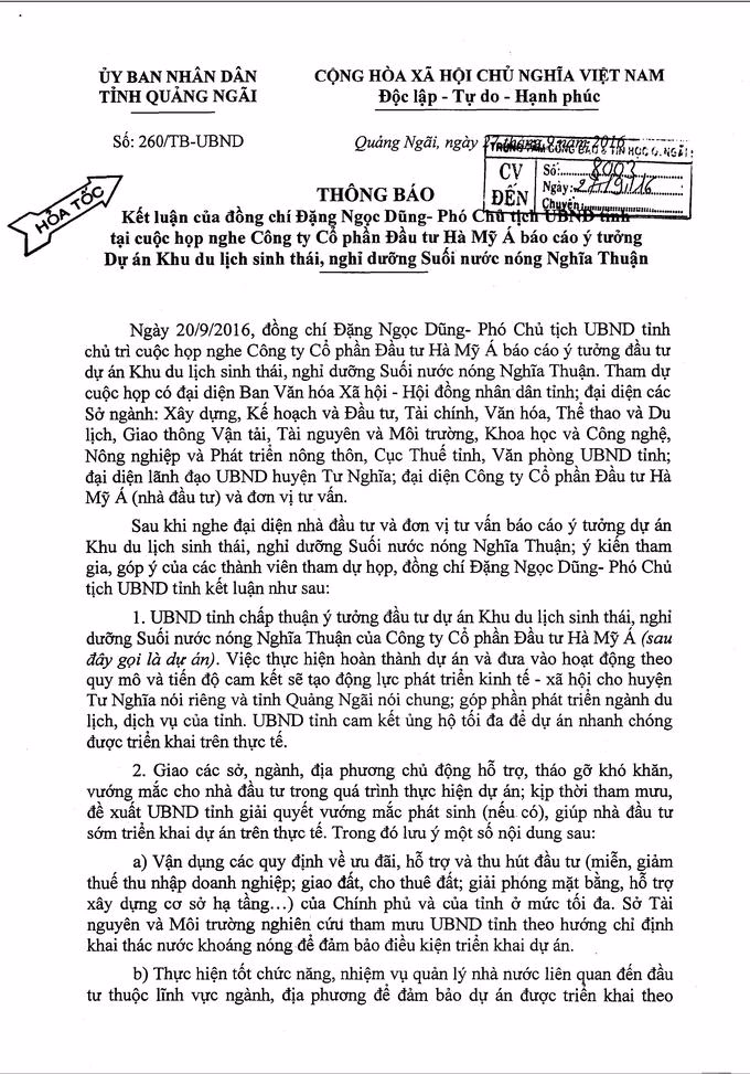 Trước những sự tạo điều kiện này là Thông báo hỏa tốc ngày 27/9/2016 của UBND tỉnh về kết luận của Phó chủ tịch UBND tỉnh Quảng Ngãi ông Đặng Ngọc Dũng.