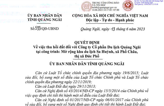 Trước đó, CTCP Du lịch Quảng Ngãi khiếu nại Quyết định số 533/QĐ-UBND ngày 13/6/2023 của UBND tỉnh về việc thu hồi đất của công ty tại công trình mở rộng khu du lịch Sa Huỳnh, xã Phổ Châu, thị xã Đức Phổ, tỉnh Quảng Ngãi.