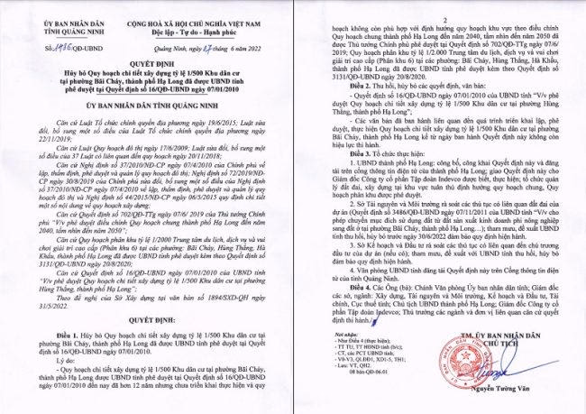 Mới đây, Chủ tịch UBND tỉnh Quảng Ninh – ông Nguyễn Tường Văn ký Quyết định số 1486/QĐ-UBND, ngày 7/6/2022 thu hồi, hủy bỏ Quyết định số 16/QĐ-UBND ngày 7/01/2010 của UBND tỉnh Quảng Ninh.