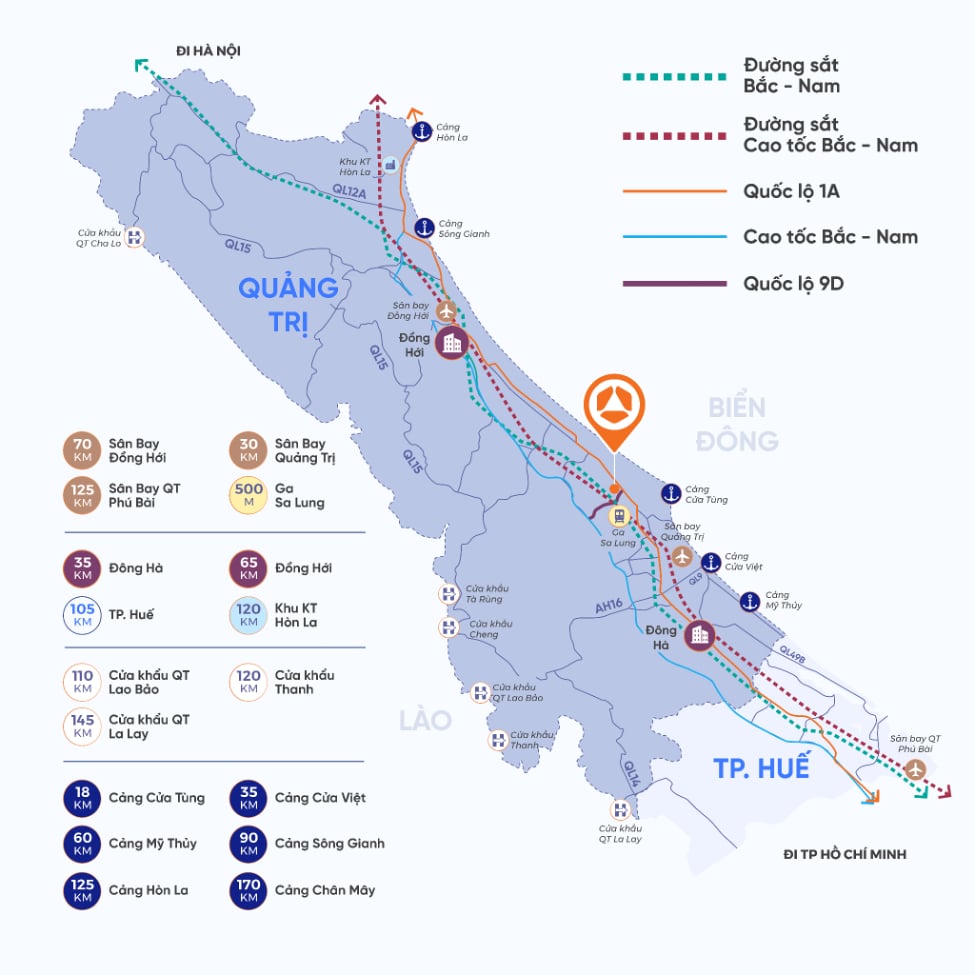 ● Kết nối: QL1A, QL9D, đường sắt Bắc Nam, Cảng Mỹ Thủy (~60km), Sân bay Quảng Trị (đang triển khai)