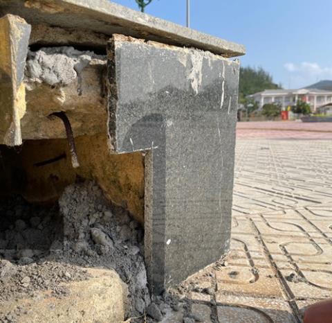 | Khối bê tông tại quảng trường trung tâm huyện Lý Sơn vỡ vụn (Ảnh Dân việt). |