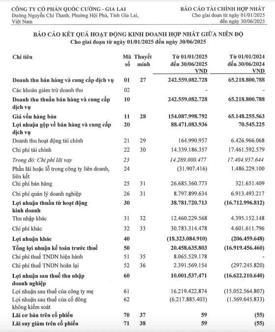 Quốc Cường Gia Lai vừa công bố báo cáo tài chính kiểm toán bán niên năm 2025 với doanh thu thuần đạt 242,5 tỷ đồng, tăng gấp 3,7 lần so với cùng kỳ. Trong đó, mảng bất động sản đóng góp lớn nhất với 73%, còn mảng cao su và bán điện chiếm lần lượt 7% và 19,4%. Sau khi trừ chi phí, doanh nghiệp báo lãi trước thuế 20,5 tỷ đồng, tăng mạnh so với khoản lỗ gần 17 tỷ đồng ở cùng kỳ năm trước.
