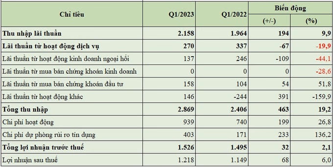 Kết thúc quý 1/2023, tổng thu nhập hoạt động của MSB đạt 2.869 tỷ đồng, tăng 19,2% so với cùng kỳ năm trước (YoY). Trong đó, thu nhập lãi thuần chiếm 75,2%, đạt 2.158 tỷ đồng, tăng 9,9% YoY (+194 tỷ đồng), dựa trên việc kiểm soát danh mục tín dụng và được dẫn dắt bởi biên lãi thuần ở mức 4,39%. Thu nhập ngoài lãi cán mốc 711 tỷ đồng, ghi nhận tăng trưởng tốt 60,9% YoY (+269 tỷ đồng) từ hoạt động mua bán chứng khoán đầu tư khi lãi thuần mảng này tăng 51,8% YoY (+54 tỷ đồng) và đặc biệt lợi nhuận khác tăng 391 tỷ đồng.