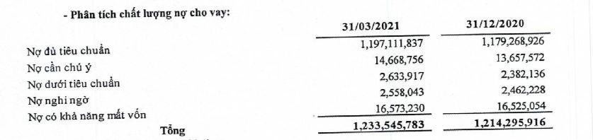 Trong đó, nợ có khả năng mất vốn vẫn ở mức 16.573 tỷ đồng; nợ dưới tiêu chuẩn tăng 11% lên mức gần 2.634 tỷ đồng; nợ nghi ngờ cũng tăng nhẹ 4% lên mức 2.558 tỷ đồng. Do đó, tỷ lệ nợ xấu trên dư nợ vẫn giữ ở mức 1,76%.