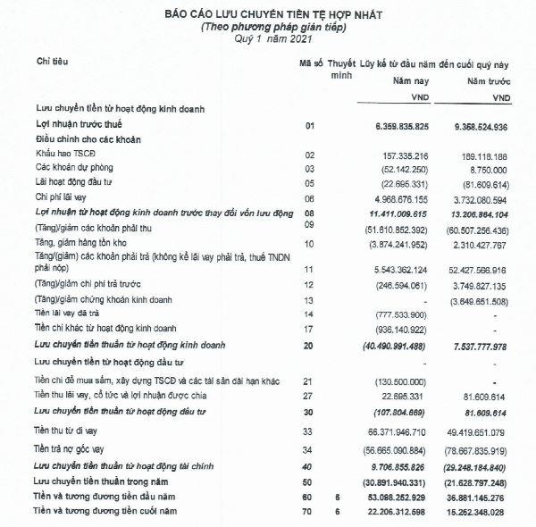 Giá vốn bán hàng trong quý 1/2021 giảm mạnh từ hơn 36 tỷ đồng về gần 48 triệu đồng khiến lợi nhuận gộp giảm 63% so với quý 1/2020, chỉ đạt được 4,7 tỷ đồng. Trong kỳ, hầu hết các chi phí đều tăng, trong đó chí phí đi vay chiếm gần 5 tỷ đồng, tăng 33%.