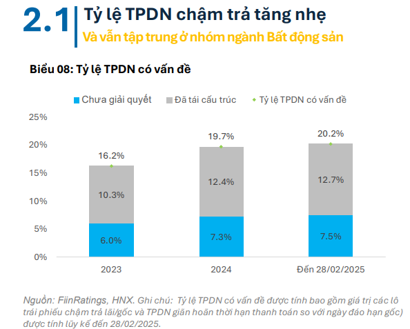 Theo báo cáo của FiinRatings về thị trường trái phiếu doanh nghiệp, so với đầu năm, thị trường ghi nhận thêm 77 lô trái phiếu doanh nghiệp có vấn đề trị giá 5,54 nghìn tỷ (tăng 2,32% so với quý 4/2024 và tăng 12,5% so với cùng kỳ năm ngoái). Tuy nhiên, giá trị tăng thêm đã chạm mức thấp nhất kể từ khi giai đoạn đỉnh điểm của trái phiếu doanh nghiệp có vấn đề vào tháng 2/2023.