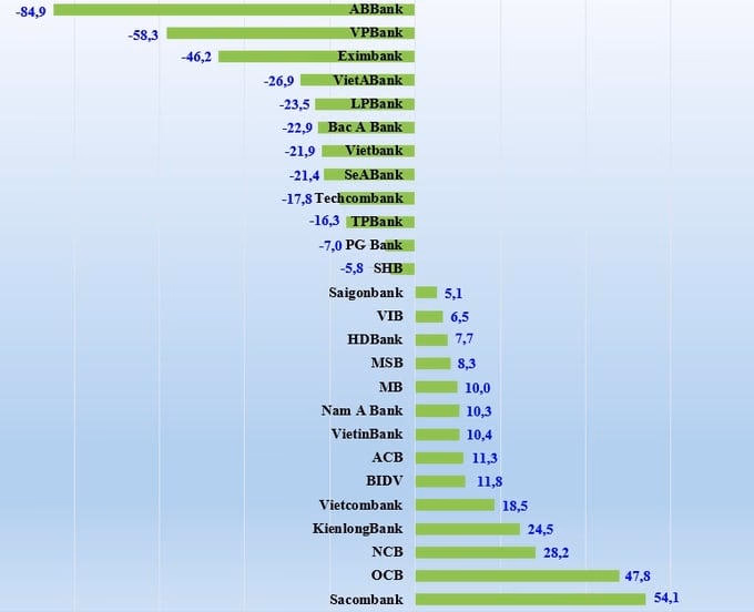 VietABank, LPBank, Bac A Bank, Vietbank, SeABank, Techcombank, TPBank, PGBank, SHB là những ngân hàng có lợi nhuận giảm từ mức -26,9% YoY đến -5,8% YoY.