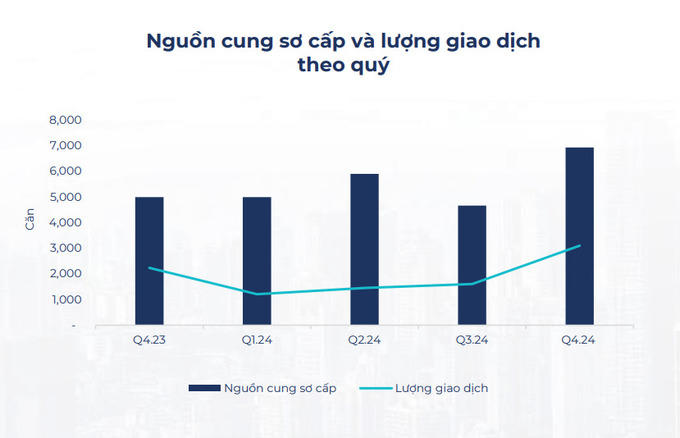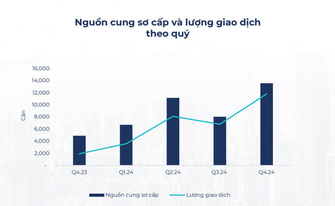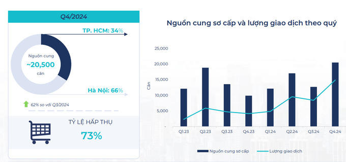 Báo cáo thị trường quý 4 của BHS Group cho biết, lượng giao dịch trong quý 4/2024 đạt 14.919 căn, tăng 77% so với quý trước, và tăng gấp 3,6 lần so với cùng kỳ năm trước. Lũy kế cả năm có khoảng 37.750 căn hộ được tiêu thụ, tăng gấp đôi so với năm 2023, lượng giao dịch đa phần đến từ các dự án tại Hà Nội. Trong quý 4/2024, nguồn cung nhà ở cao tầng ở Hà Nội tiếp tục chiếm ưu thế, cao gấp đôi so với TP HCM.