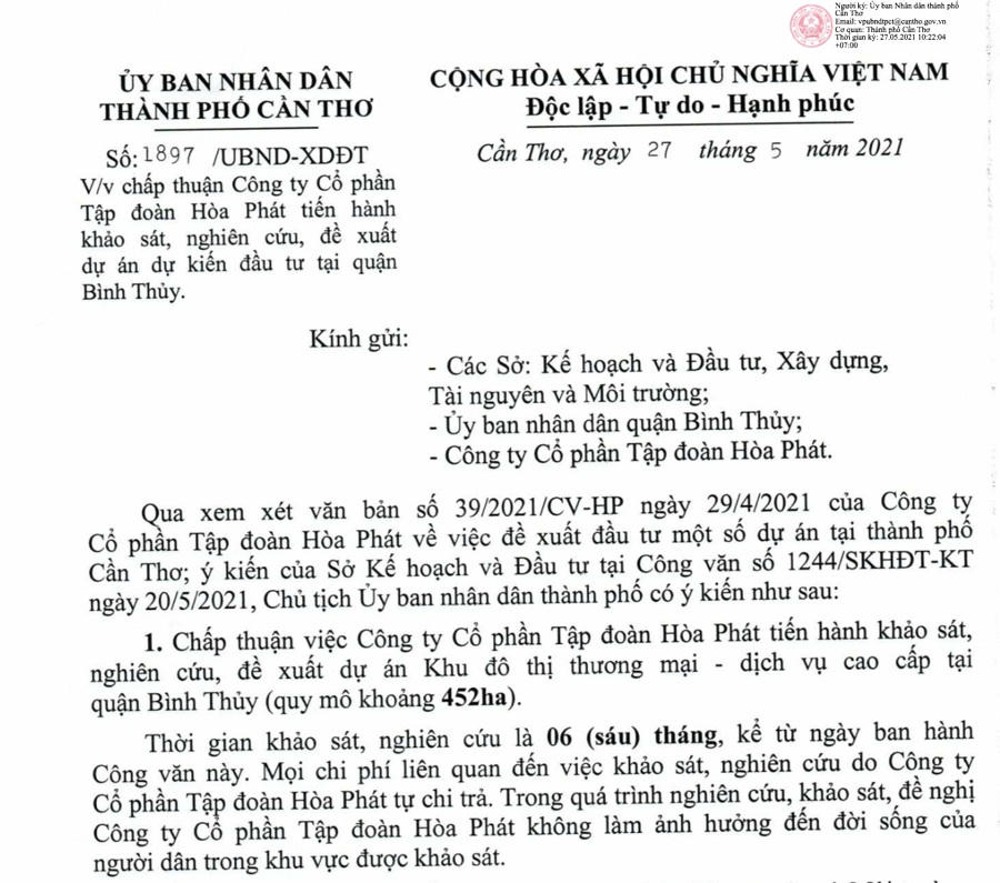 Trước đó, ngày 6/5, UBND TP Cần Thơ cũng có công văn chấp thuận cho Tập đoàn Hòa Phát khảo sát, nghiên cứu, đề xuất hai dự án tại quận Cái Răng và quận Ninh Kiều.