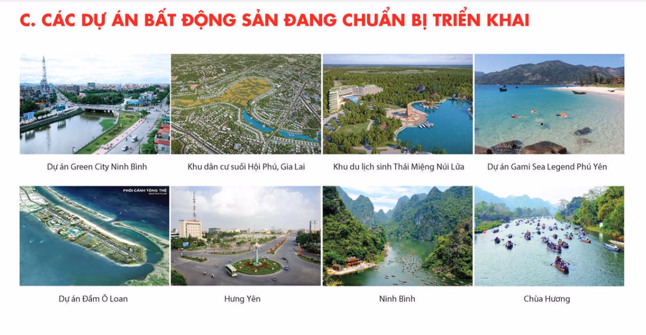 Theo thông tin trên Website Gami Group, danh mục các dự án mà Gami Land đang chuẩn bị triển khai còn có: Green City Hoa Lư, Ninh Bình quy mô 91,6 ha; Dự án Tràng An - Ninh Bình quy mô 77 ha; Khu dân cư suối Hội Phú tại Gia Lai rộng 49,7 ha; Khu du lịch sinh thái Miệng Núi Lửa tại Gia Lai 27,6 ha; Dự án Gami Sea Legand Phú Yên quy mô 64 ha; Dự án Đầm Ô Loan tại Phú Yên rộng 336 ha.