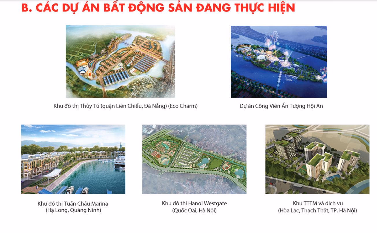 Bao gồm: Khu đô thị và dịch vụ Tây Quốc Oai (KĐT Hà Nội Westgate) quy mô 56,9 ha; Dự án Khu TTTM và Dịch vụ (Khu công nghệ cao Hoà Lạc, Thạch Thất, Hà Nội) quy mô 1,92 ha; KĐT Tuần Châu Marina quy mô gần 10,8 ha tại TP Hạ Long, Quảng Ninh; KĐT Thủy Tú (Eco Charm) tại quận Liên Chiểu, TP Đà Nẵng rộng 60 ha; dự án Công viên Ấn Tượng Hội An quy mô 10,9 ha.