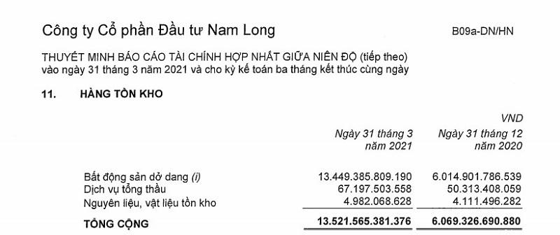 Việc nắm quyền kiểm soát, hợp nhất vào báo cáo tài chính tại doanh nghiệp trên cũng khiến tổng giá trị hàng tồn kho của Nam Long tăng đáng kể. Cụ thể, giá trị hàng tồn kho tại thời điểm 31/3 là 13.522 tỷ đồng, tăng 7.453 tỷ so với đầu kỳ. Trong bất động sản dở dang, bên cạnh dự án Đồng Nai Waterfront (7.174 tỷ đồng), còn có dự án Hoàng Nam (2.381 tỷ), dự án Paragon Đại Phước (1.708 tỷ), dự án Vàm Cỏ Đông (1.140 tỷ).