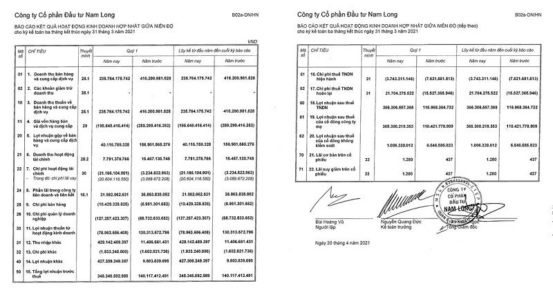Theo BCTC hợp nhất Quý 1/2021, NLG ghi nhận doanh thu thuần hợp nhất đạt 235,7 tỉ đồng, giảm gần một nửa so với cùng kỳ năm trước. Trừ đi giá vốn hàng bán, NLG báo lãi gộp ở mức 40,1 tỉ đồng, giảm 3,9 lần so với cùng kỳ năm 2020. Bên cạnh đó các khoản chi phí trọng yếu khác của NLG tăng mạnh so với cùng kỳ. Cụ thể, chi phí lãi vay tăng 6,8 lần, ở mức 20,6 tỉ đồng. Chi phí bán hàng tăng 1,5 lần, đạt 10,4 tỉ đồng. Chi phí quản lý doanh nghiệp tăng 1,85 lần, đạt 127,2 tỉ đồng.