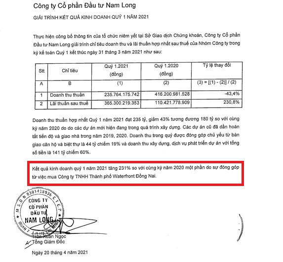 Loại trừ đi các chi phí thuế thu nhập doanh nghiệp, NLG báo lãi ròng 366,3 tỉ đồng Quý 1/2021, cao gấp 3 lần cùng kỳ năm trước và cũng là mức lãi cao nhất so với cùng kỳ 4 năm trở lại đây. Đáng chú ý việc tăng sở hữu tại doanh nghiệp dự án Dong Nai Waterfront City đã mang lại cho NLG khoản thu nhập khác lên tới 429,1 tỉ đồng, góp phần giúp công ty này thoát lỗ trong quý đầu tiên của năm 2021.