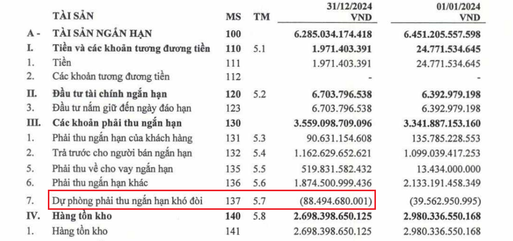 Đáng chú ý, nợ xấu của doanh nghiệp lại “phình to” khi dự phòng thu ngắn hạn khó đòi gấp 2,2 lần đầu năm với gần 89 tỷ đồng, do phải lập dự phòng 50 tỷ đồng đối với CTCP Đầu tư Solaris Việt Nam.