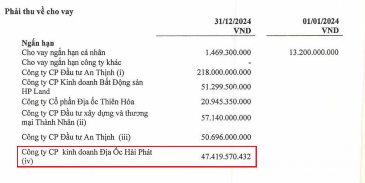 Tại Báo cáo tài chính quý IV/2024 của HPX, tại ngày 31/12/2024, doanh nghiệp này không còn ghi nhận khoản đầu tư nào tại Hải Phát Land nhưng còn ghi nhận khoản phải thu về cho vay đối với Hải Phát Land là hơn 47 tỷ đồng, trong đó toàn bộ là khoản vay ngắn hạn.