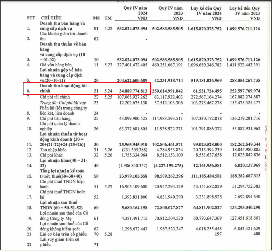 Tuy nhiên, dù doanh thu thuần có tăng trưởng, nhưng sự sụt giảm mạnh của doanh thu tài chính đã ảnh hưởng đáng kể đến kết quả chung. Cụ thể, doanh thu tài chính trong kỳ chỉ đạt gần 35 tỷ đồng, giảm đến 86% so với cùng kỳ năm trước. Nguyên nhân chính là việc công ty không còn ghi nhận khoản lãi hơn 214 tỷ đồng từ bán các khoản đầu tư như trong quý 4/2023.
