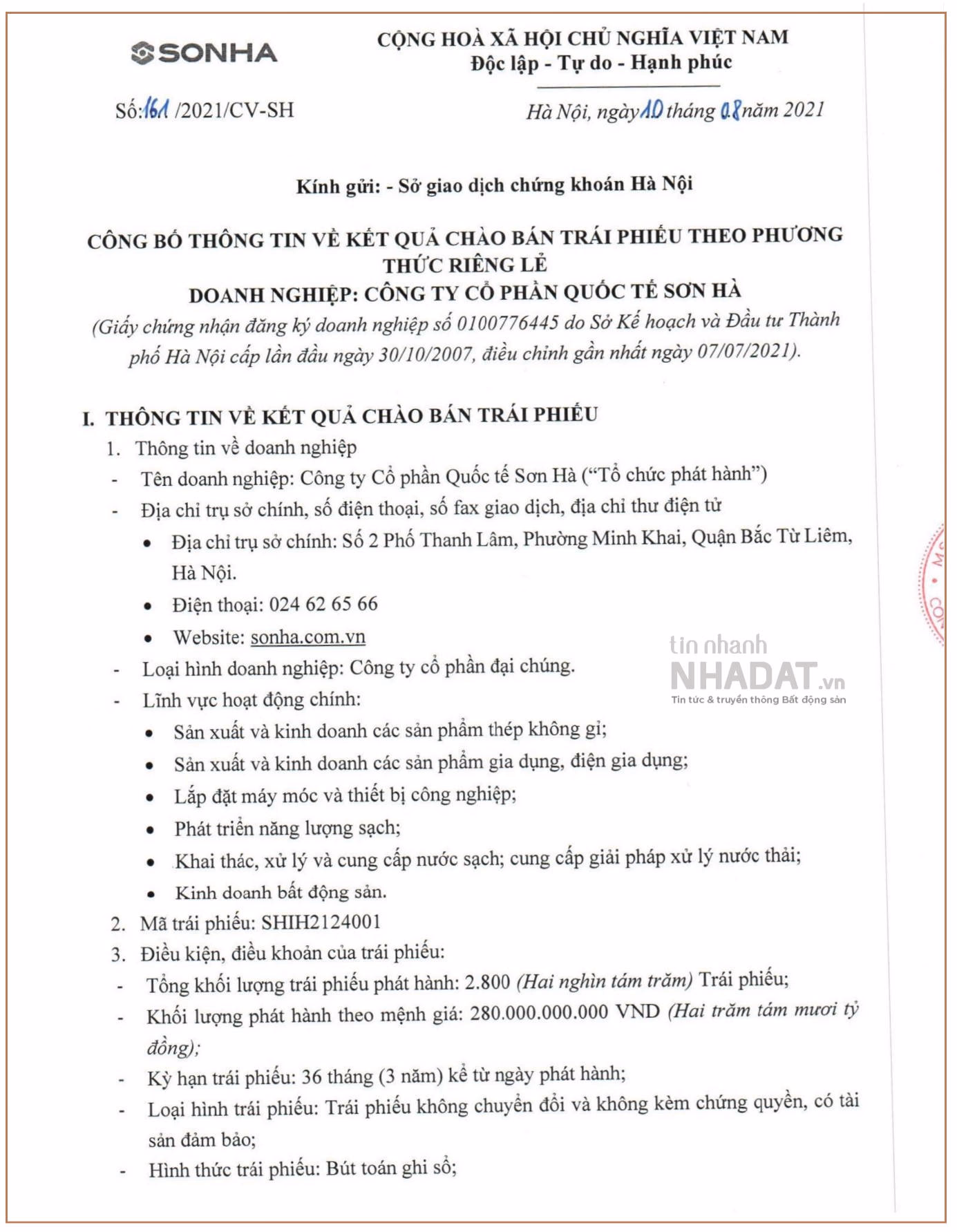 Cụ thể, theo thông tin được công bố ngày 10/9 từ Sở giao dịch Chứng khoán Hà Nội (HNX), CTCP Quốc tế Sơn Hà đã huy động thành công 280 tỷ đồng từ việc phát hành trái phiếu riêng lẻ. Cụ thể, số lượng trái phiếu phát hành là 2.800 trái phiếu có kỳ hạn 36 tháng kể từ ngày phát hành.