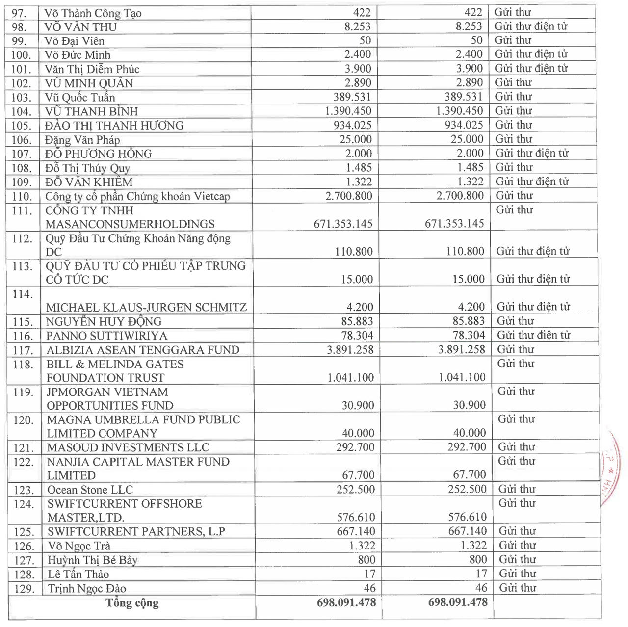 Cùng với việc công bố nghị quyết của ĐHĐCĐ, MCH đồng thời công bố danh sách 129 cổ đông tham gia biểu quyết, đại diện cho hơn 698 triệu cổ phần. Trong đó, Công ty TNHH Masan Consumer Holdings nắm giữ với số lượng lớn nhất, hơn 671 triệu cổ phiếu MCH.