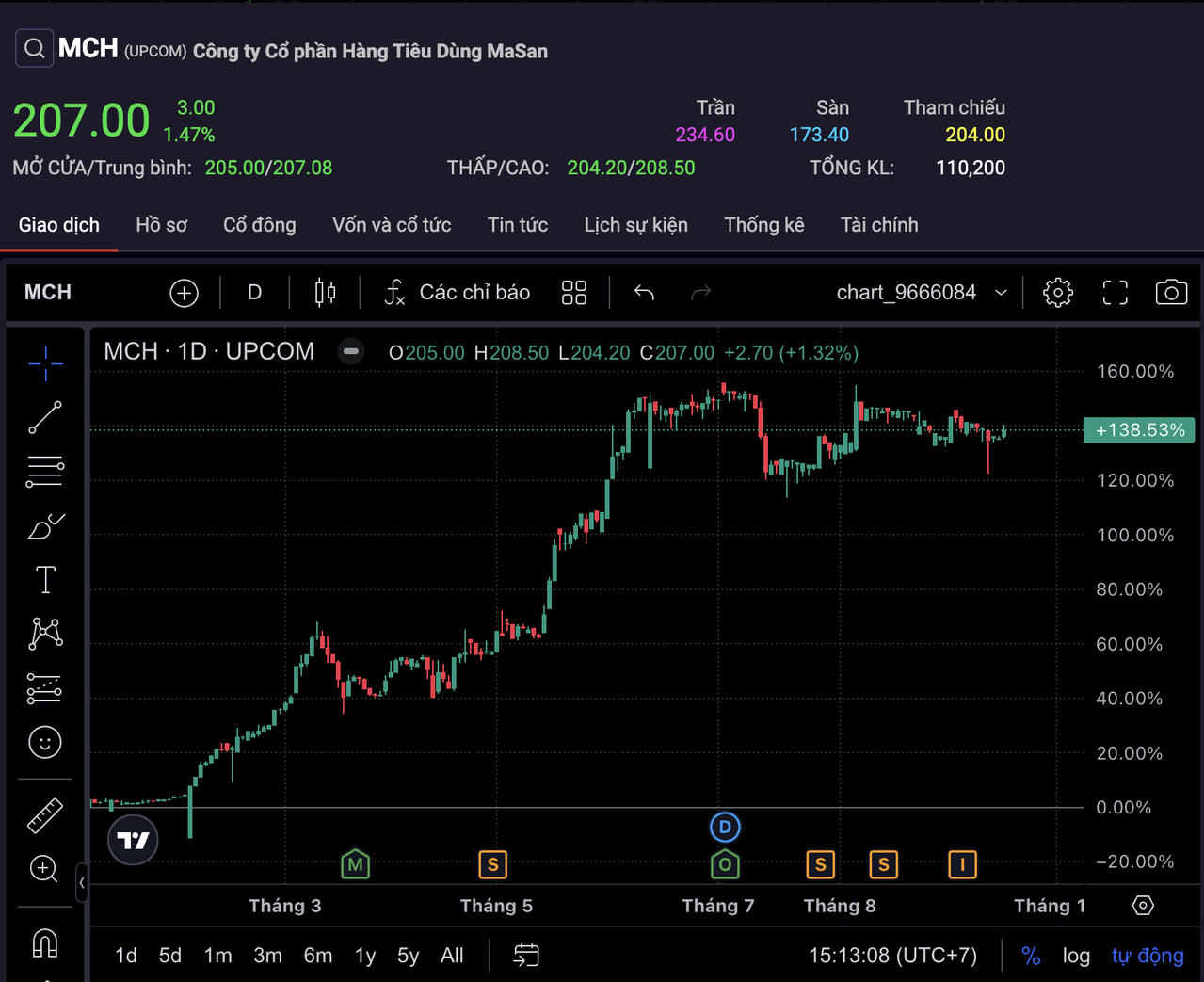 Tính từ đầu năm đến nay, MCH đã ghi nhận mức tăng trưởng ấn tượng, thị giá tăng gấp 2,3 lần từ mức 86.980 đồng/cổ phiếu (giá điều chỉnh phiên đầu năm 2024) lên mức 205.000 đồng/cổ phiếu (giá mở cửa phiên 17/9).