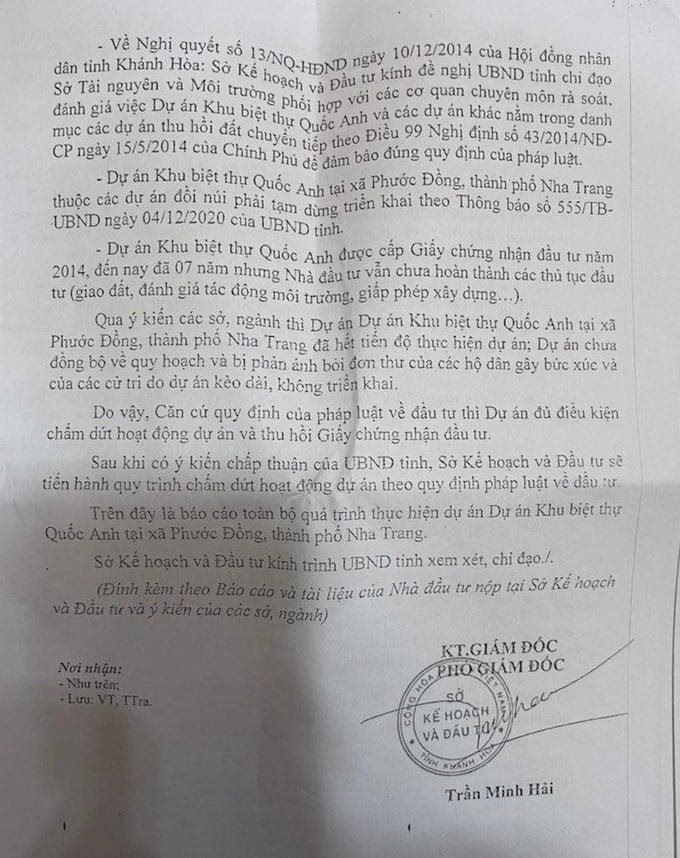 Còn nguyên nhân khách quan về việc thu hồi thì Dự án Khu biệt thự Quốc Anh tại xã Phước Đồng, thành phố Nha Trang thuộc các dự án đồi núi phải tạm dừng triển khai. Đồng thời, dự án thuộc diện Nhà nước thu hồi đất theo Nghị quyết số 13/NQ-HĐND ngày 10/12/2014. Do đó, tại thời điểm hiện nay, nhà đầu tư không thể thực hiện các thủ tục tiếp theo do dự án chưa phù hợp với quy hoạch chung và các quy hoạch có liên quan.
