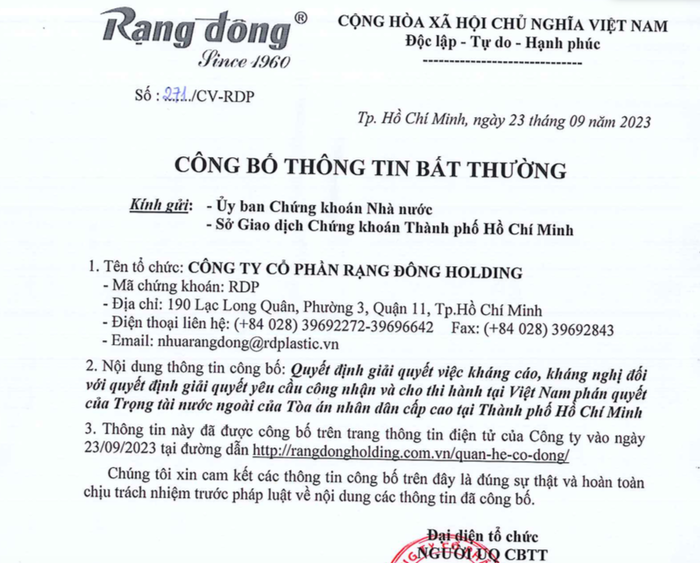 Công ty Cổ phần Rạng Đông Holding vừa công bố thông tin bất thường về việc giải quyết việc kháng cáo, kháng nghị đối với quyết định giải quyết yêu cầu công nhận và cho thi hành tại Việt Nam phán quyết của trọng tài nước ngoài của tòa án nhân dân cấp cao tại TP. HCM.
